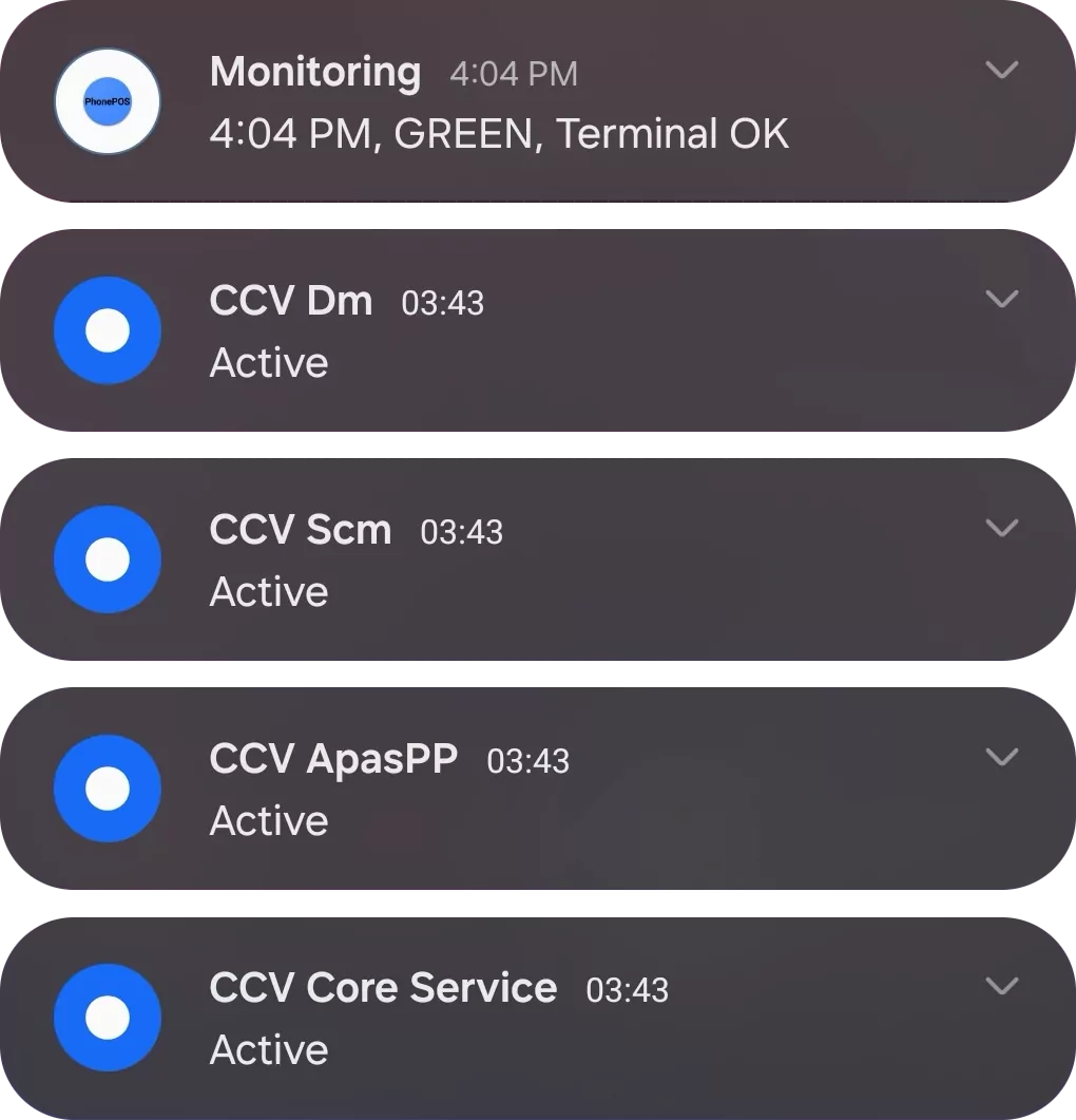 To ensure swift payment processing, PhonePOS operates in the background and displays a persistent notification to prevent the Android system from terminating the process. This notification consists of multiple sub-notifications.